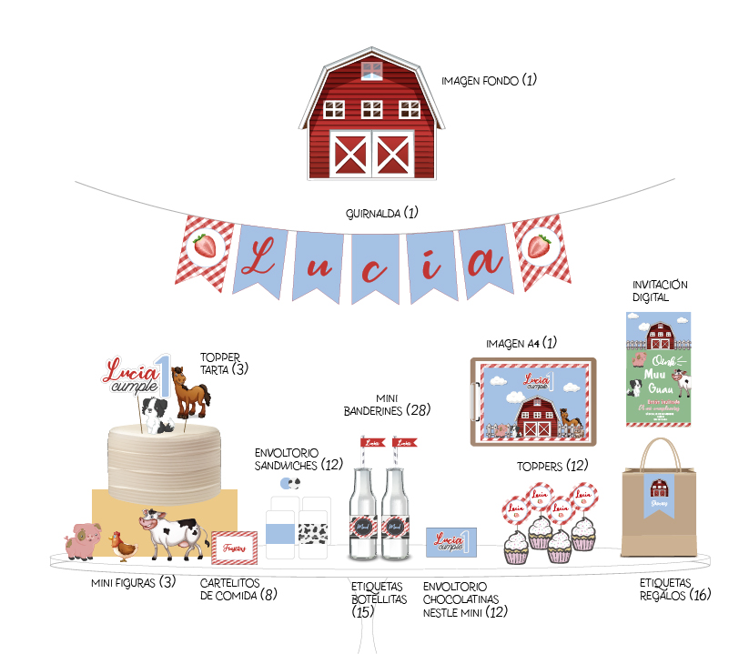 Incluye el kit imprimible preparado y listo para usar, el menaje y las chuches. Solo necesitas una mesa y en 15 minutos tendrás listo tu propio candy sin complicaciones.
